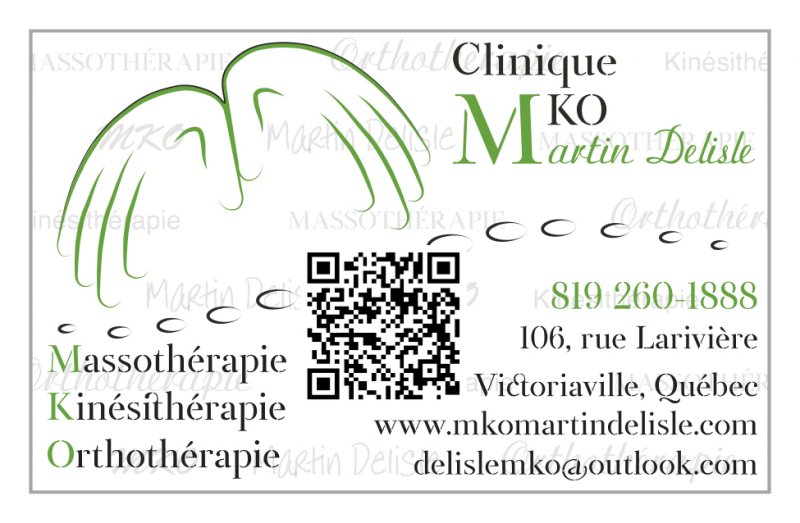 Clinique MKO Martin Delisle is a massage therapy, physiotherapy and orthotherapy clinic located in Victoriaville. Martin Delisle, the owner, is RITMA accredited. He offers a multitude of treatments at his clinic, but can also come to your home, at a small fee.