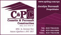 Cossette et Perreault Construction Inc is a company located in Amos that specializes in renovation and construction of all kinds. They serve the residential and commercial sector of Abitibi-Témiscamingue and the surrounding areas.