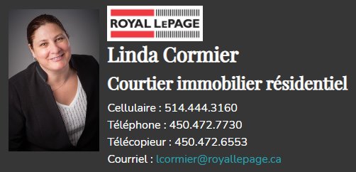 Whether you want to sell your property or buy the house of your dreams, Linda Cormier will be there to accompany you and help you with the whole process of sale or purchase. She is always available to advise you and answer your questions. Trust her experience and contact her right now!